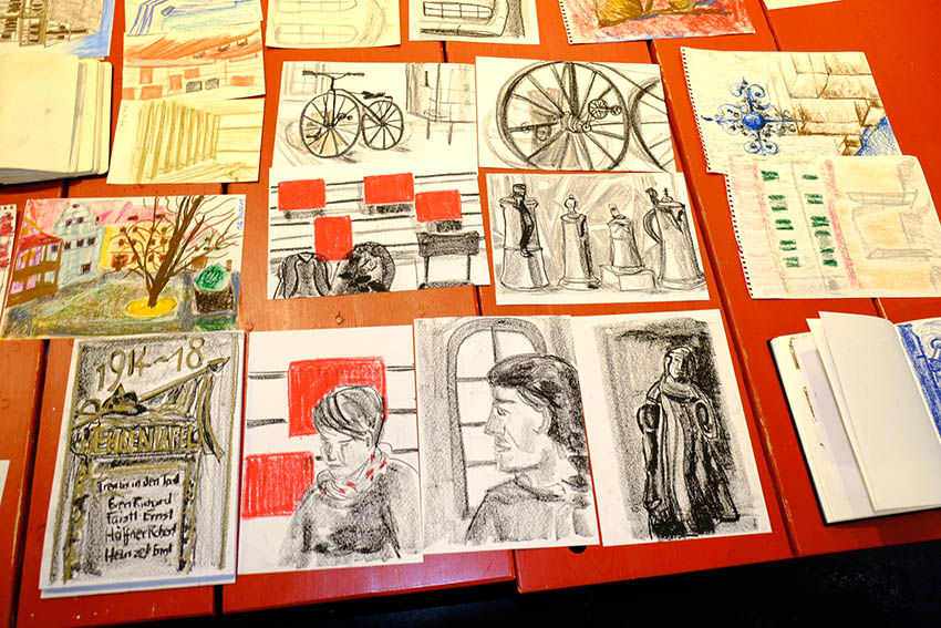 Am Samstag, trafen wir uns zum gemeinsamen Sketchcrawl unter Anleitung von Nadja Pidan. Die Künstlerin und Leiterin der Kunstschule Backnang hatte eingeladen, mit Ölkreiden Skizzen anzufertigen, möglichst monochrom und flächig. Die Idee dahinter war, weg von den kleinen, detailverliebten Zeichnungen zu kommen und Schatten und Flächen besser wahrzunehmen. Im warmen Stadtmuseum durften wir die Ausstellung erkunden und am Schluss unsere Zeichnungen bewundern. Vielen Dank an alle Urban Sketchers, die wie immer mit Herzblut dabei waren und natürlich an Nadja, die immer wieder neue Ideen hat und diese Treffen bereichert.