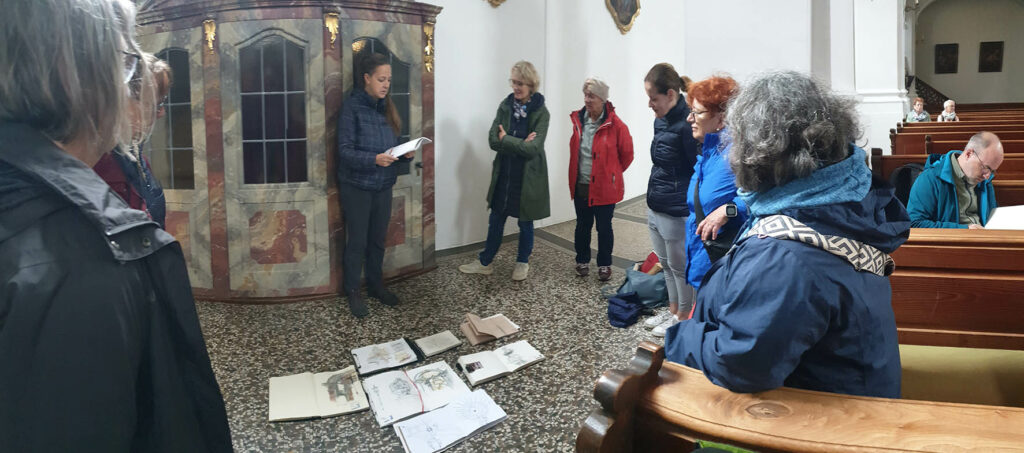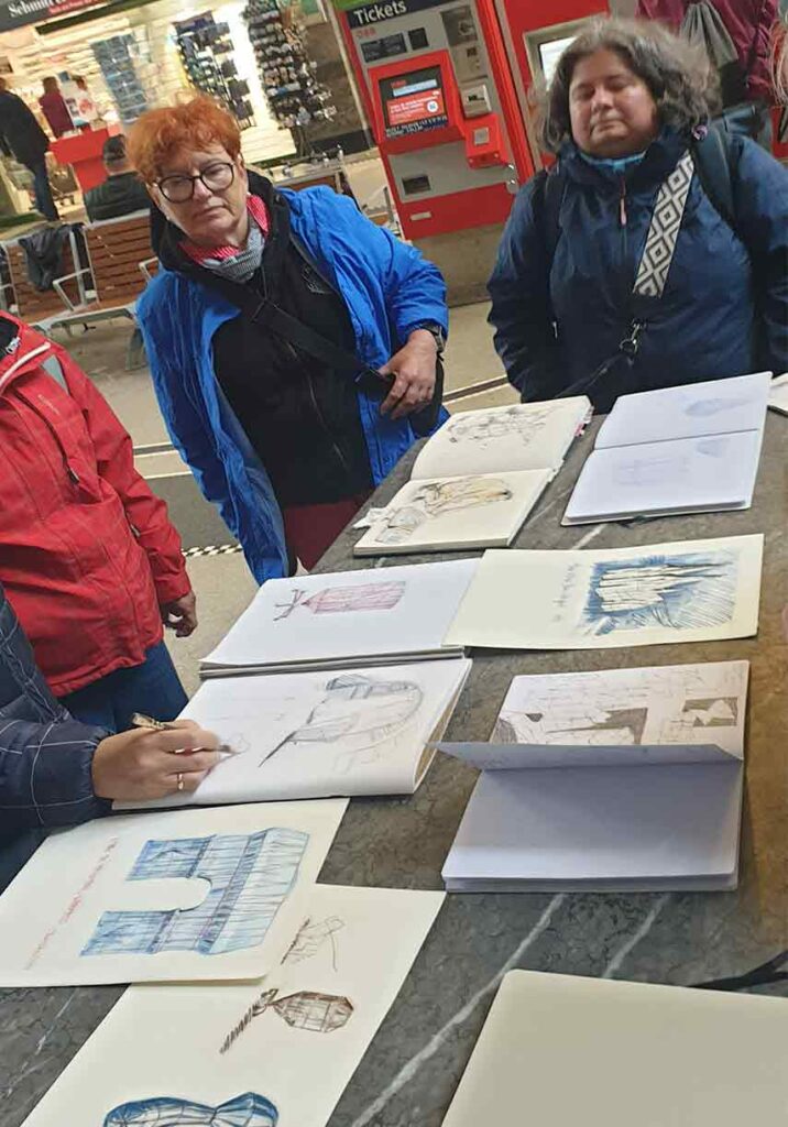 In der Mittagspause fanden wir ein schönes Lokal, um uns zu stärken. Im ehemaligen Kanonissen-Stift, heute Hotel und Gasthof, verbrachten wir in idyllischer Atmosphäre unsere Mittagspause und konnten unsere Eindrücke verarbeiten und dazu leckeren Kaiserschmarrn essen. Am Nachmittag besuchten wir alle, wetterbedingt, die aktuelle Christo-Ausstellung im Kunstmuseum. Es war eine wirklich tolle Inspirationsquelle, was einige dazu veranlasste, alle weiteren skizzierten „Dinge“ einzupacken … Es machte so viel Spaß, dass im historischen Bahnhof weiterhin alles Mögliche „verpackt“ gezeichnet wurde. Zum Ausklang machten wir dann noch schnelle Skizzen von den Besuchern, die dort ein- und ausgingen.
