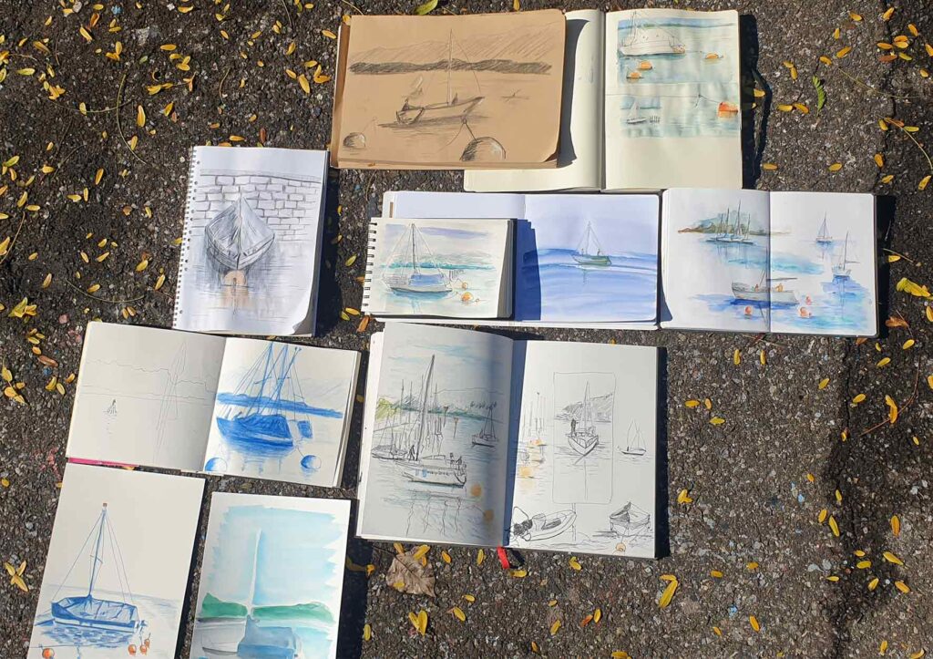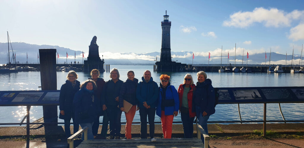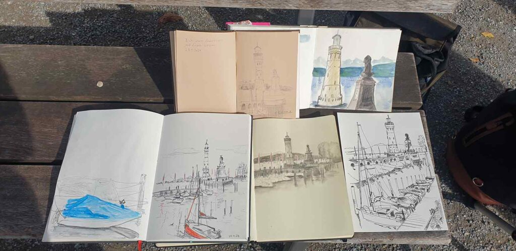 Am Abend verabredeten wir uns gemeinsam im Gasthof Stift zum Essen. Es wurde ein sehr schöner, geselliger Abend, bei dem Nadja die Frühaufsteher (earlybirds) zum Zeichnen des Sonnenaufganges über dem See, am Sonntagmorgen, animierte. Tatsächlich kamen auch ein paar wenige… Der Sonntagmorgen zeigte sich sehr freundlich. Man traf sich im Hafen, um die schönen Farben und Kontraste auf dem See einzufangen und wieder einmal das Abstrahieren zu üben. Nicht jedes Boot, jedes Seil und jede Boje und jeder Pfosten muss auf die Skizze! Eine weitere Übung dazu gab es noch in den schönen Gassen von Lindau. Hier ging es auch darum, nicht jedes Tor, Fenster, Haus oder Detail zu zeichnen, sondern die Stimmung und die Farben einzufangen und durch wenige Details zu ergänzen. Dabei sind sehr schöne und lockere Skizzen entstanden. Nach dieser Übungseinheit verabschiedeten wir uns von Nadja. Einige wollten den schönen sonnigen Nachmittag beim Skizzieren am See verbringen. Die Wahrzeichen von Lindau mussten zum Ausklang als Modelle herhalten. Insgesamt war es ein sehr intensives und kreatives Wochenende, und man konnte sich ganz auf das Zeichnen konzentrieren.
