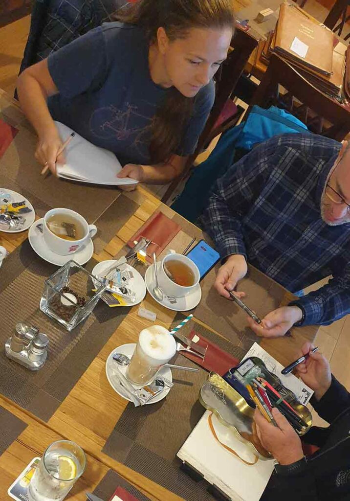 Erwartungsfroh fanden sich alle Kursteilnehmerinnen und -teilnehmer am Freitagabend im Café Corner am Hafen ein. Einige kannten sich schon von anderen Kreativkursen, es wurden auch schon Skizzenbücher herumgereicht, die unsere Referentin Nadja Pidan mitgebracht hatte. Am Samstag ging es auf den Markt, dort konnten wir uns an der Inselhalle unterstellen und mit Stift und Block dem Regen trotzen. Die Marktstände, vor allem die Details dort, und die Musterwiederholungen waren das erste Thema. Danach suchten wir Unterstand im Münster und waren Gäste bei einer wunderbaren Orgelmatinee, die sich als dreihundertste und damit die Abschiedsdarbietung des Organisten herausstellte. Zu Musik zu zeichnen war ein entspannendes Erlebnis, dabei sind sehr schöne Skizzen vom Innenraum des Münsters entstanden. Hier mussten alle versuchen zu abstrahieren, um sich nicht in den Details und den Ornamenten zu verlieren und doch die vorhandene Stimmung einzufangen.