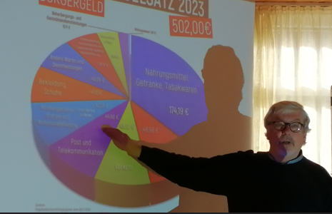 Franz Segbers, von der Universität Marburg, Theologe und Sozialwissenschaftler, stellte die soziale Spaltung anhand der ungleichen Einkommens- und Vermögensverteilung dar. Segbers warnte sein Publikum, die „soziale Spaltung eskaliert“ und forderte: „Wer über Armut redet, darf über Reichtum nicht schweigen“. Die Gefahr sei groß, dass die soziale Frage von rechten Bewegungen okkupiert werde. Anhand anschaulicher Statistiken zeigte er, wie Armut in Deutschland aussieht. Sie ist multidimensional zu begreifen, so Segbers. Im Kern geht es um die Einkommenshöhe, aber Lebenslagen, Vermögen, Wohnen und Erwerbstätigkeit sind weitere Faktoren. Offiziell wird in Deutschland als Armut definiert, was bis zu 60% des mittleren Einkommens umfasst. Konkret handelt es sich beim Einpersonenhaushalt um ein Einkommen von rund 1.100 Euro. Von Armut bedroht sind über ein Drittel der Menschen hierzulande. Mehr als einem Drittel in Deutschland drohte schon 2020 die Zahlungsunfähigkeit, also lange vor der derzeitigen Inflation.